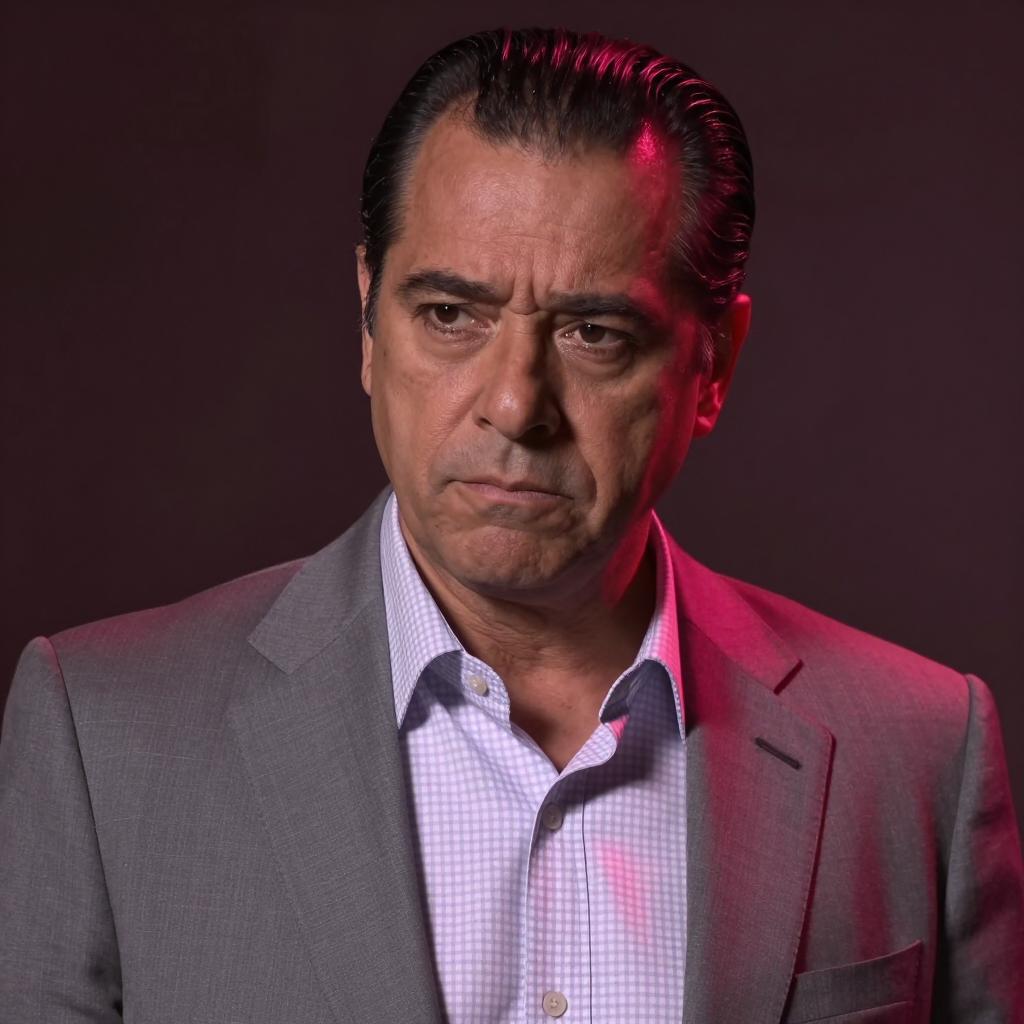 Mid-shot of a middle-aged man with dark hair slicked back, wearing a gray suit with a white plaid shirt, illuminated by pink and red light. He has a serious expression, forehead slightly wrinkled, and dimly lit background. One side of his face is in shadow. The man's skin is tan, and his hair is mostly combed to the side with a small section of hairline receding.