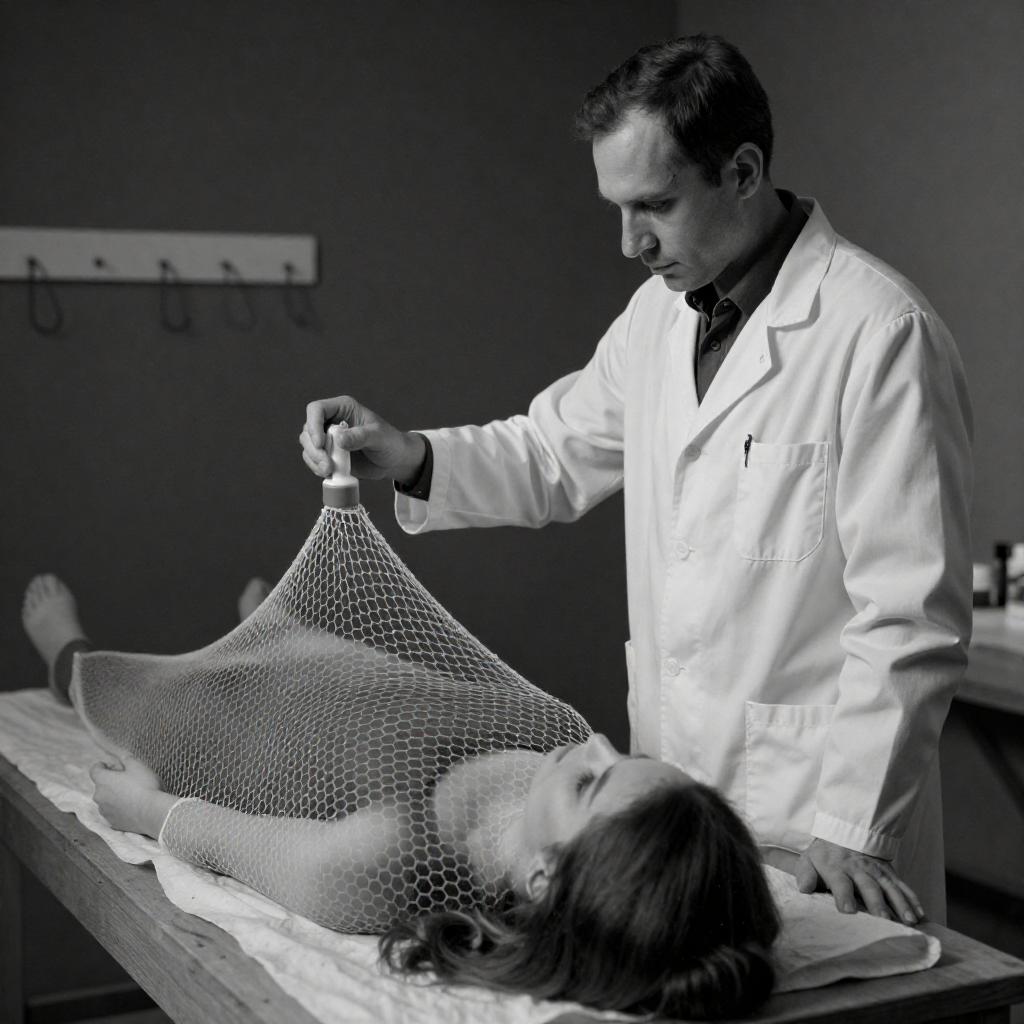 Black-and-white photograph of a man in a lab coat spraying a mesh covering over a nude woman lying on a wooden table. Hexagonal patterns on mesh, hooks on the wall, dark background. Man's expression focused, woman's face not visible.