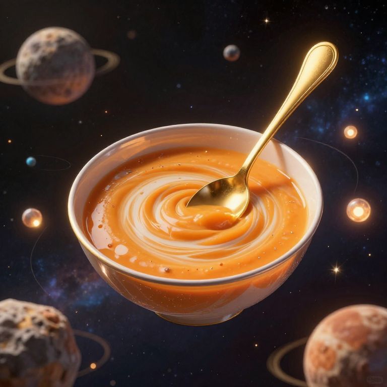 Cosmic bowl suspended in space, filled with swirling orange soup, is being stirred by a golden spoon as numerous rocky planets and glowing orbs orbit around it, creating a mesmerizing celestial spectacle.
