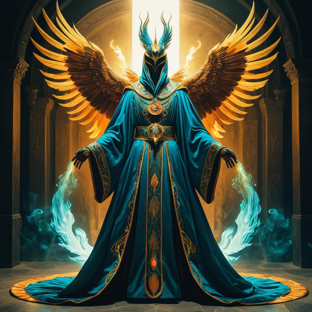 Surrealist fantasy full-body portrait of an enigmatic phoenix rider adorned in flowing ceremonial robes. The figure is richly decorated with golden and turquoise details and wears a majestic headdress resembling phoenix flames. Behind the figure, two large, radiant phoenix wings spread wide, illuminated by a dramatic backlight with spectral glows. The scene evokes a mystical and regal atmosphere reminiscent of Salvador Dalí and Moebius art styles.