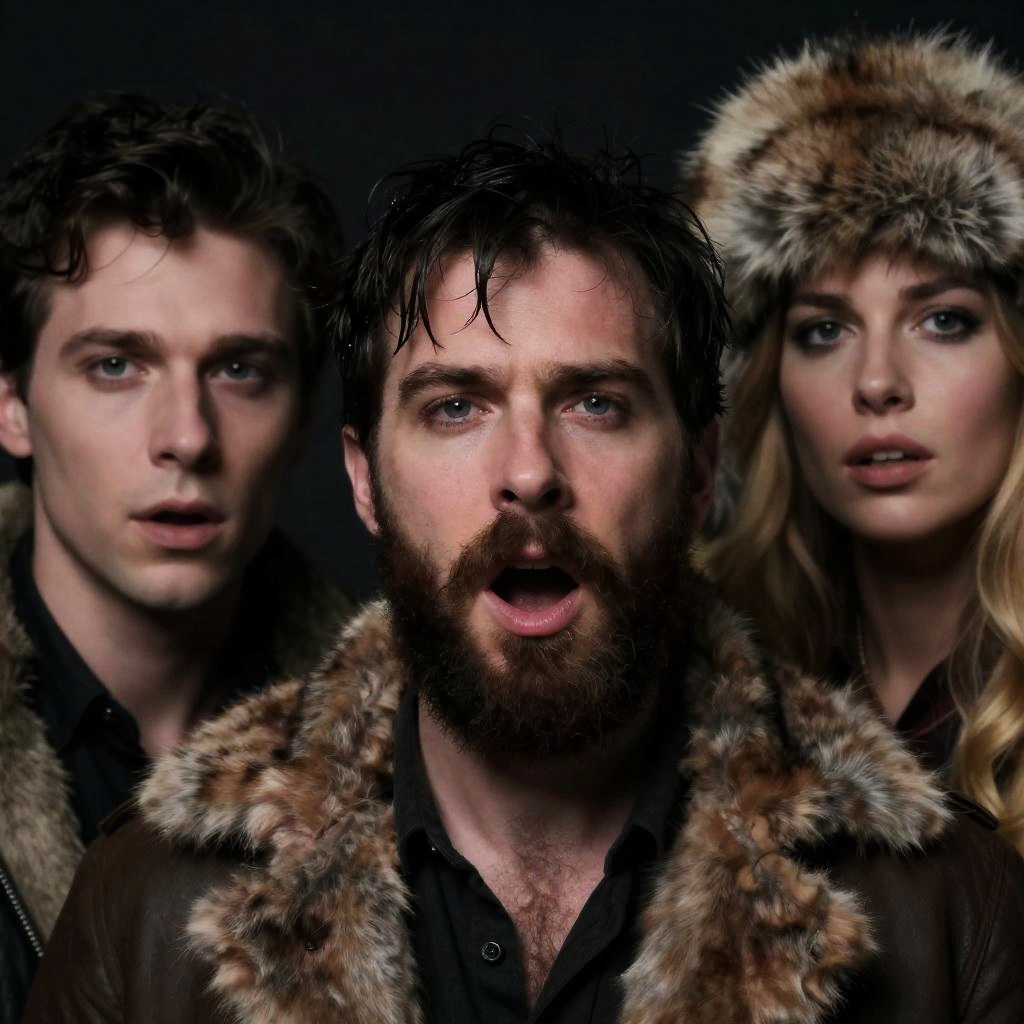 Photograph of three people in close-up. Bearded man with dark, wet hair and open mouth in center. Man on left with short, dark hair and slightly open mouth. Woman on right with blonde hair, fur hat, and intense expression. All wear fur clothing. Dark background.