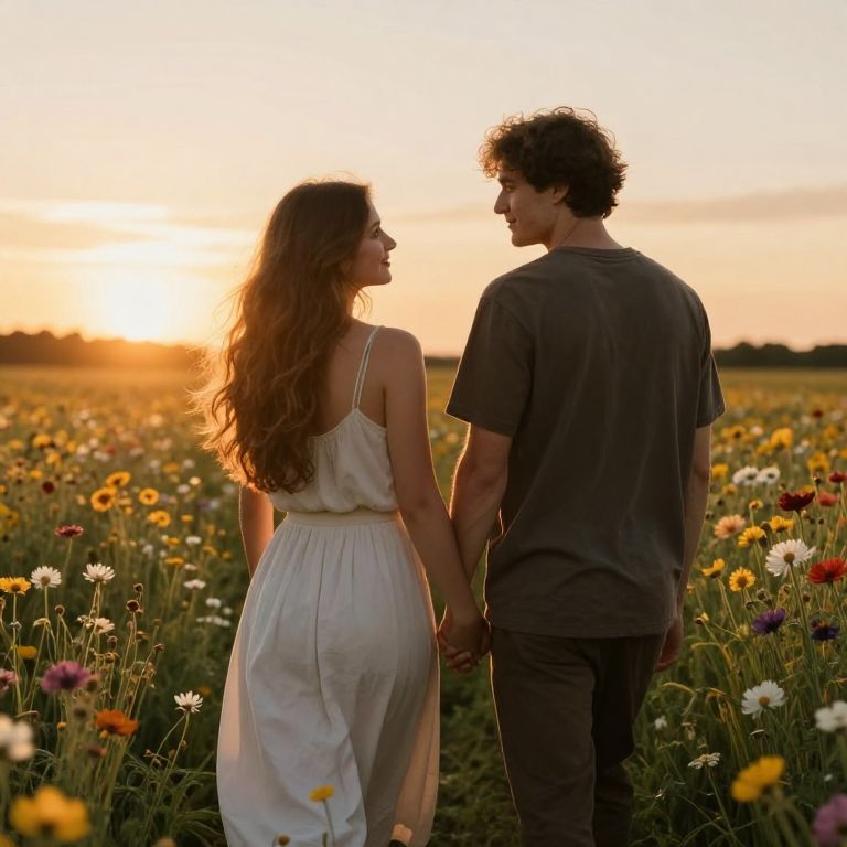 Two souls entwined in a tender embrace of love walk hand-in-hand through a field of vibrant blooms, their journey illuminated by the golden glow of a setting sun, evoking a profound sense of hope, freedom, and the timeless beauty of connection.