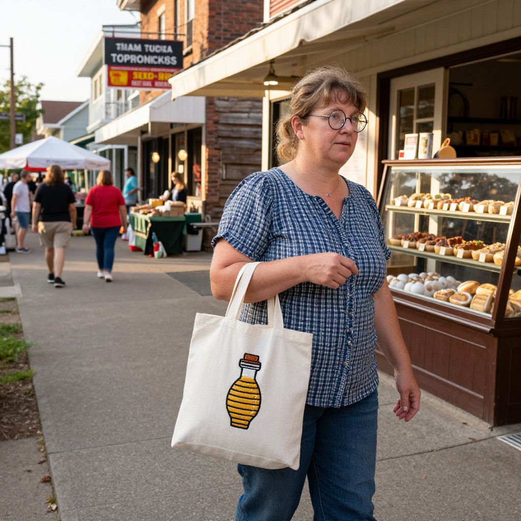 A realistic photo of a busy street scene in a mid-sized town, where a middle-aged woman with round glasses and a kind face is walking past a local bakery, holding a tote bag with a honey graphic embroidered on the front, the setting is sunny with warm afternoon light and visible signs of a local farmers' market nearby.