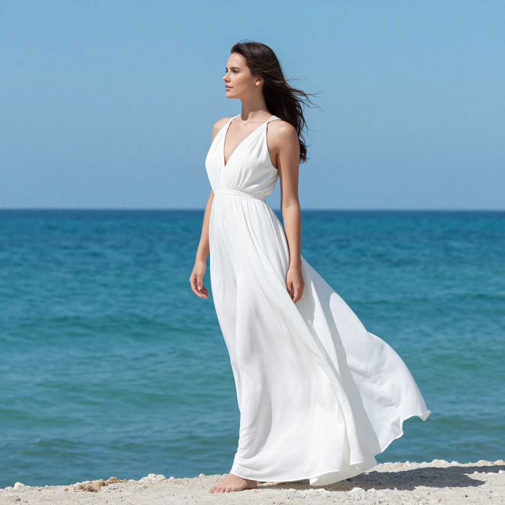 Radiant serenity washes over the scene as a woman in a flowing white gown stands by the turquoise sea, her presence a harmonious blend of elegance and freedom, embodying the timeless beauty of a moment suspended between earth and sky.