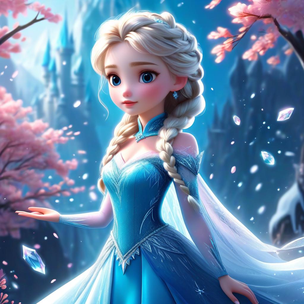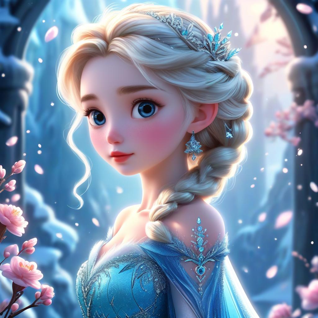 A digital illustration of a fantasy ice princess with long platinum blonde hair styled in a braid, dressed in a shimmering blue gown with icy embellishments. She stands in a mystical snowy forest with glowing snowflakes and magical ice elements surrounding her.