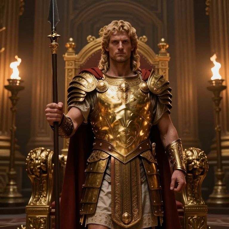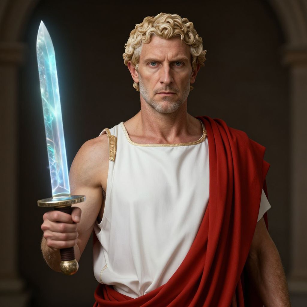 "Comic Book Art Realistic photo of Human Marcus Aurelius in a red and white toga wielding a blade of opalescent flame, portrait - - v5,"