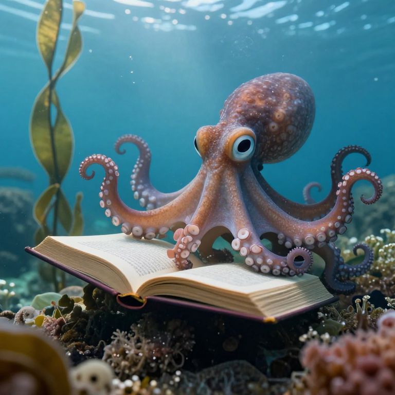 In the serene depths of the ocean, a curious octopus embarks on a journey of intellectual exploration, its tentacles delicately turning pages of an open book, while the gentle sway of kelp and the faint hum of marine life whisper tales of knowledge and wonder beneath the surface.