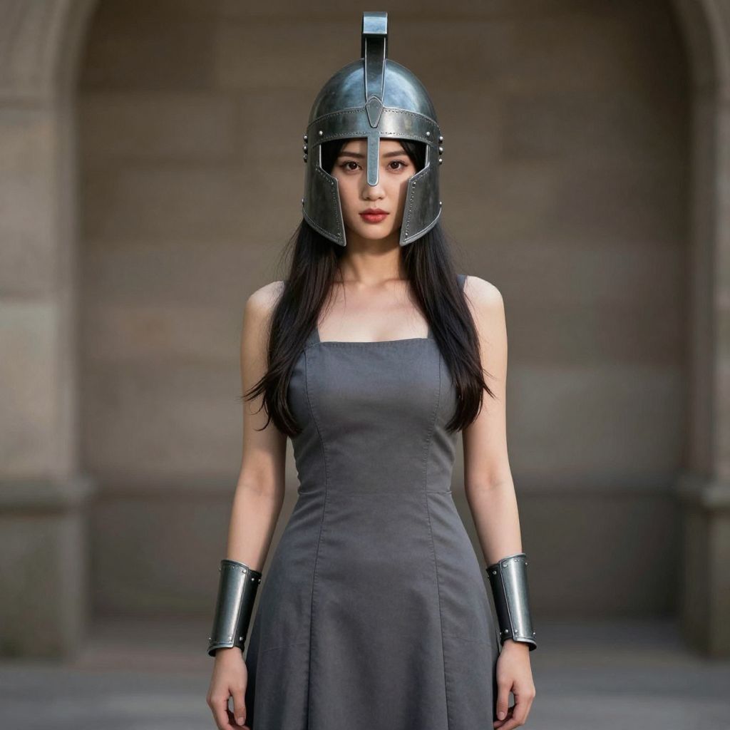 Digital art: Asian woman with long black hair, wearing a dark gray dress, metallic helmet, and cuffs, stands in a stone archway.