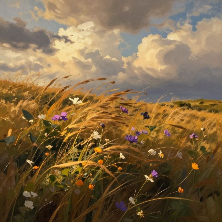 Vibrant digital painting of a golden field with swaying grass, purple and orange wildflowers, under a dramatic, cloudy sky.