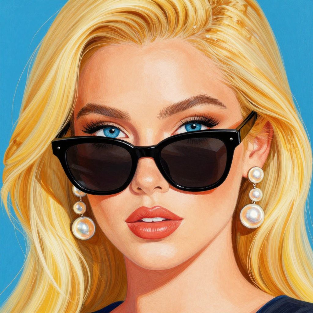 Vibrant portrait of a woman with striking blonde hair, bold blue eyes accentuated by black sunglasses, and three pearl earrings, rendered in vivid detail by artist Nava Judith.