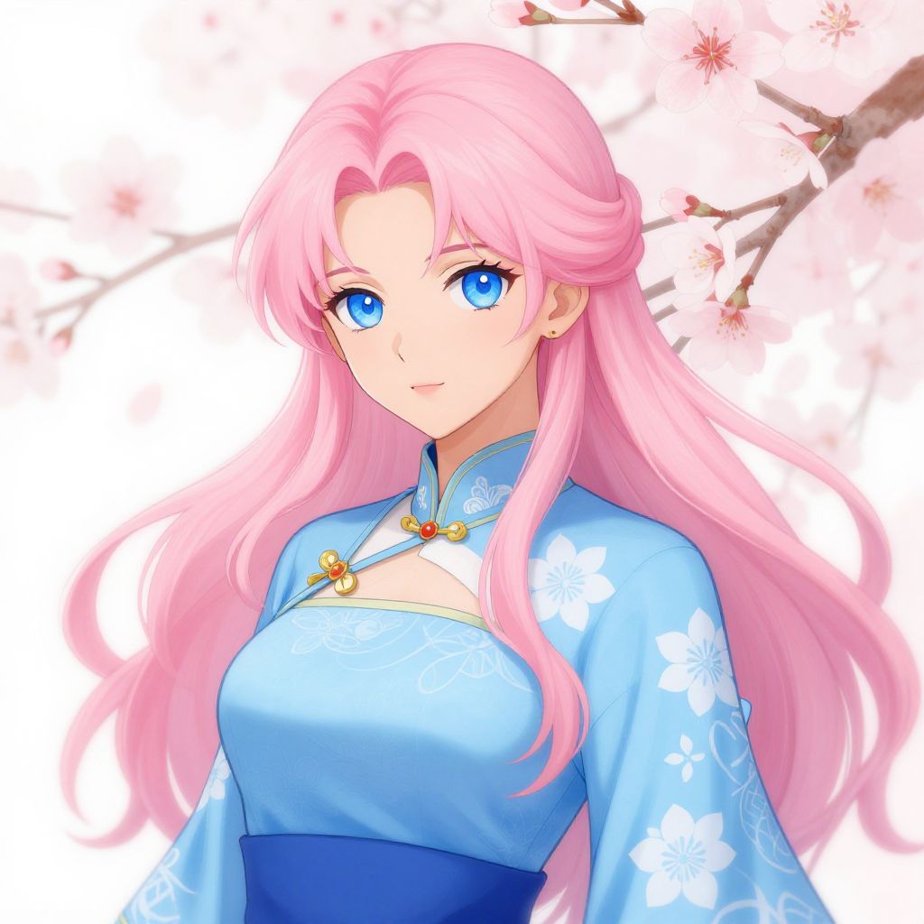 A digitally illustrated woman with striking blue eyes and long pink hair is dressed in an elegant, traditional-style blue floral dress. The artwork features delicate cherry blossom branches in the background, rendered in a vibrant and detailed anime-inspired style with smooth shading and pastel colors.