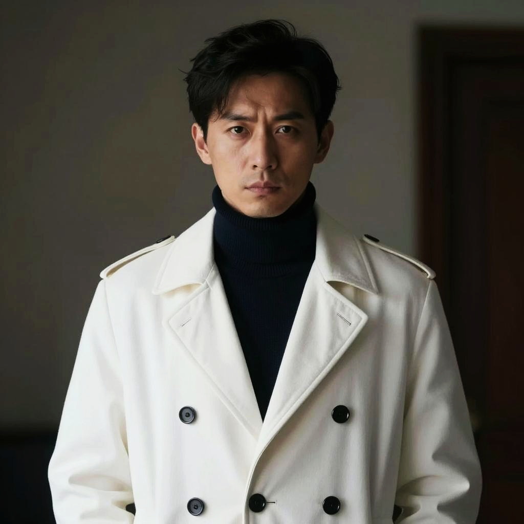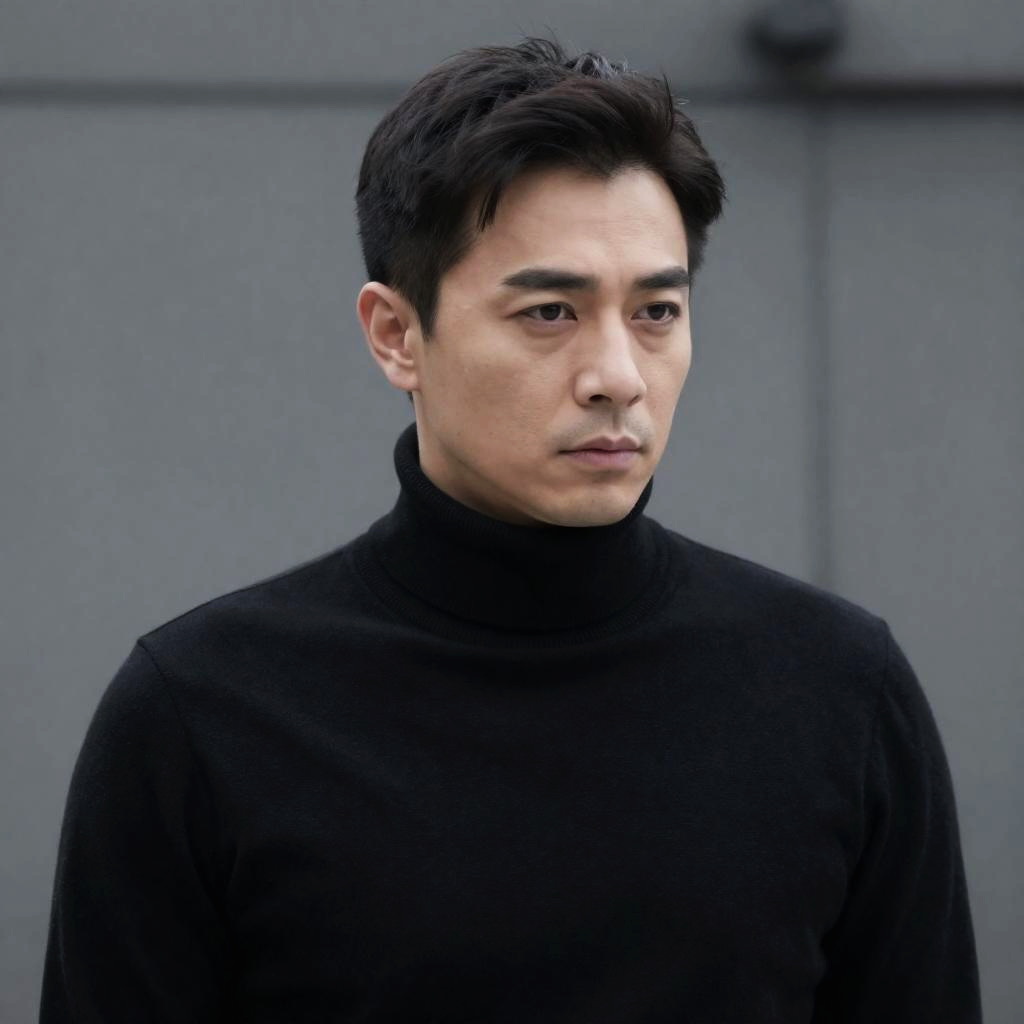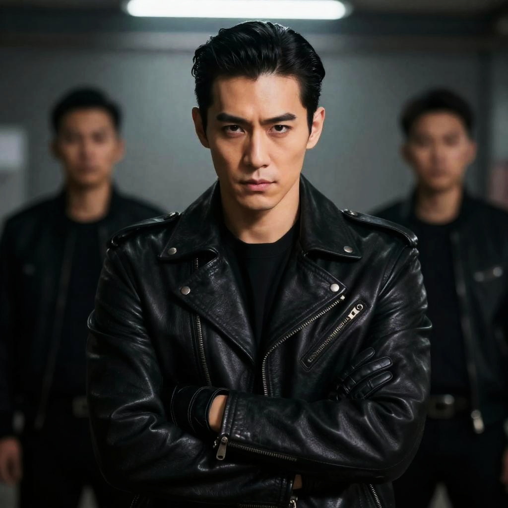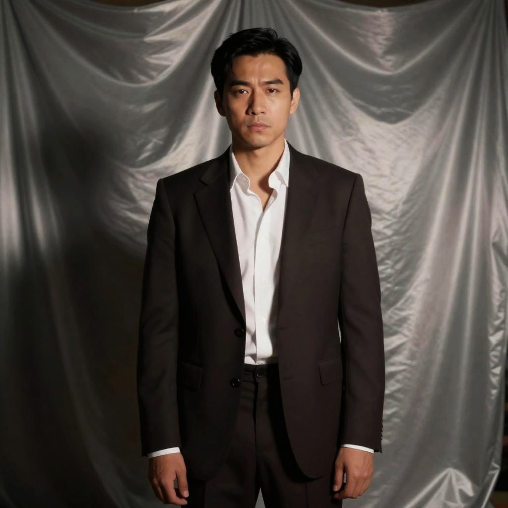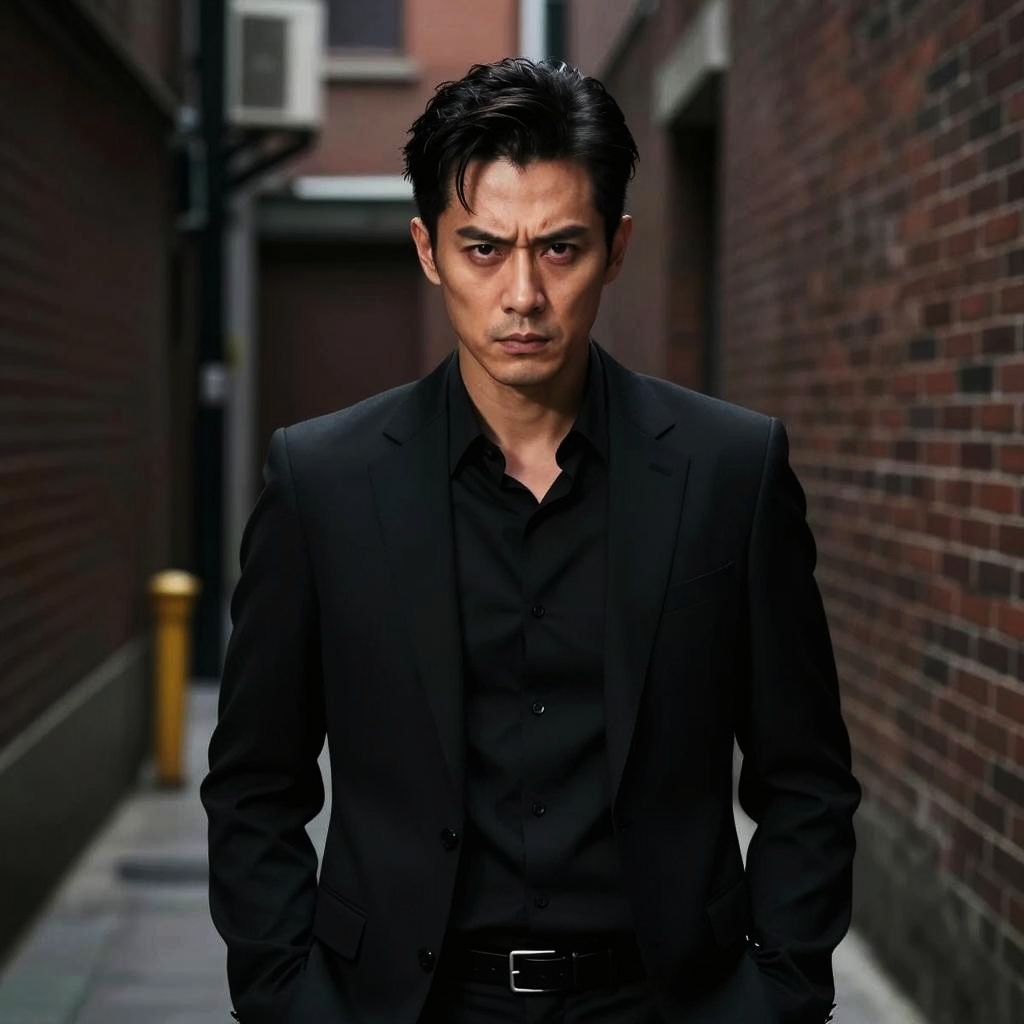 A man with a stern expression stands in a dimly lit alleyway, dressed in a black suit and shirt that contributes to the overall artistic noir style of the image. The surrounding brick walls add to the dramatic and intense atmosphere.