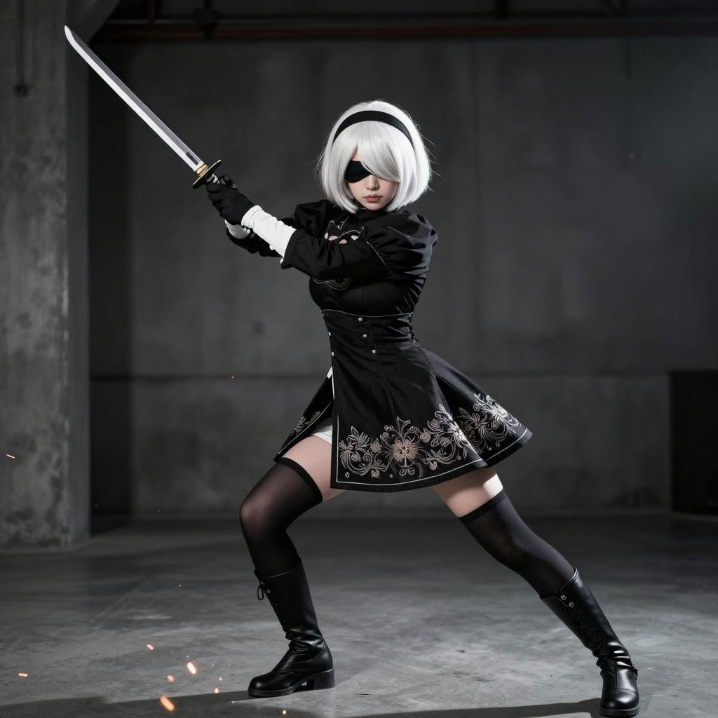 Female cosplayer with blonde bob, black blindfold, and black outfit with white embroidery. Holding a katana with glowing gold rings. White panties visible under short skirt. Black thigh-high boots. Dynamic pose, left leg raised, sword raised. Background: blurred industrial setting. Photo. Nifa Autographia in bottom right. Intense expression.
