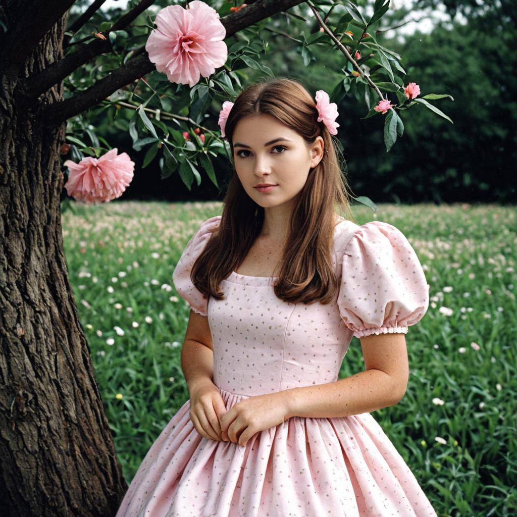 A young blonde woman wearing a sleeveless pink tea party dress with lace details stands on green grass next to a tree adorned with pink flowers. She has long straight hair and white shoes, looking directly at the viewer in a natural outdoor setting with a forest background.