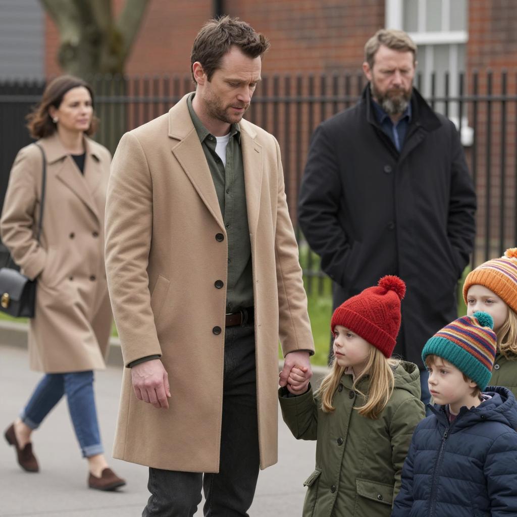 Photograph of a family on a porch. Man in green hat, dark suit, gestures to family. Family: mother in pink sweater, father in dark shirt, two children, one with baby. Child with baby looks down, others look at man. Green house, lantern, window.