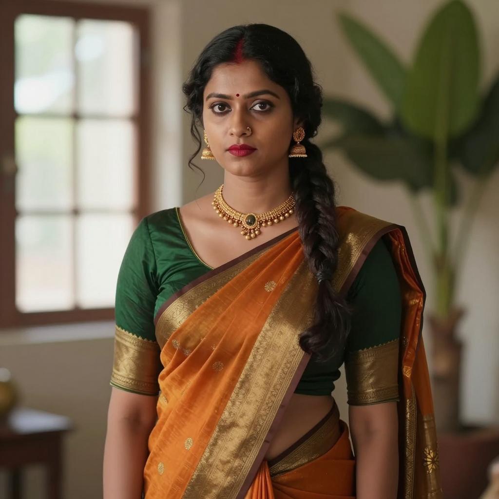 Kora banarasi saree, photograph of an Indian woman standing in a garden, wearing a pink and orange traditional sari with white blouse, colorful flowers in the background, sunny day, greenery, blurred trees, woman with dark hair in a bun, earrings, necklace, bracelets, serious expression, vibrant colors, natural light, daytime, outdoor setting, floral arrangement, traditional attire