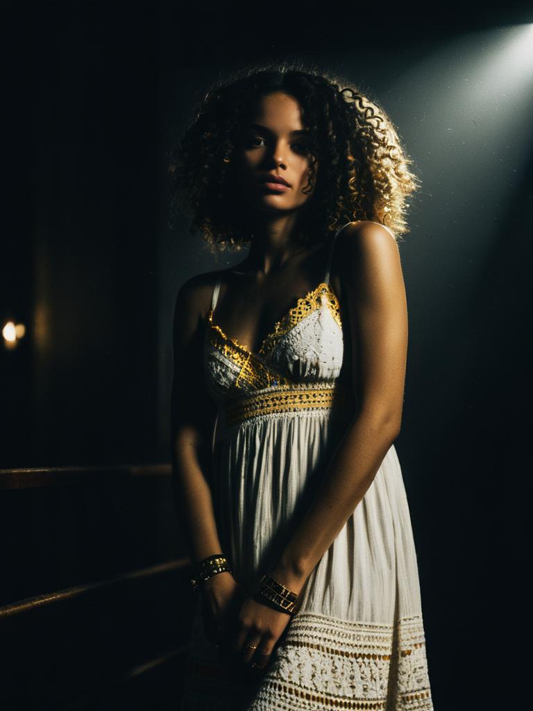 Portrait of a young woman with curly hair wearing a white sleeveless crochet sundress featuring floral patterns and an empire waist. The dress is knee-length with thin black straps. She accessorizes with a silver cuff bracelet and gold-toned bracelets. The photo is taken in a dimly lit studio setting with a neutral dark background and focused lighting.