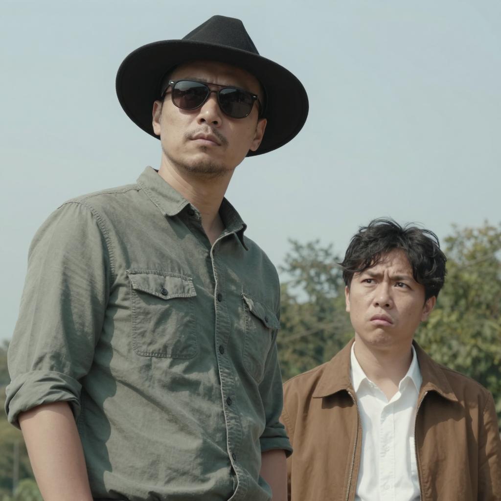 Photograph of a submarine crew. Four men in white shirts and grey vests. Central man grips steering wheel intensely. Man on left leans on edge, serious expression. Man on right wears black cap, distant look. Background is dark, misty. Submarine's metal hull dominates foreground.