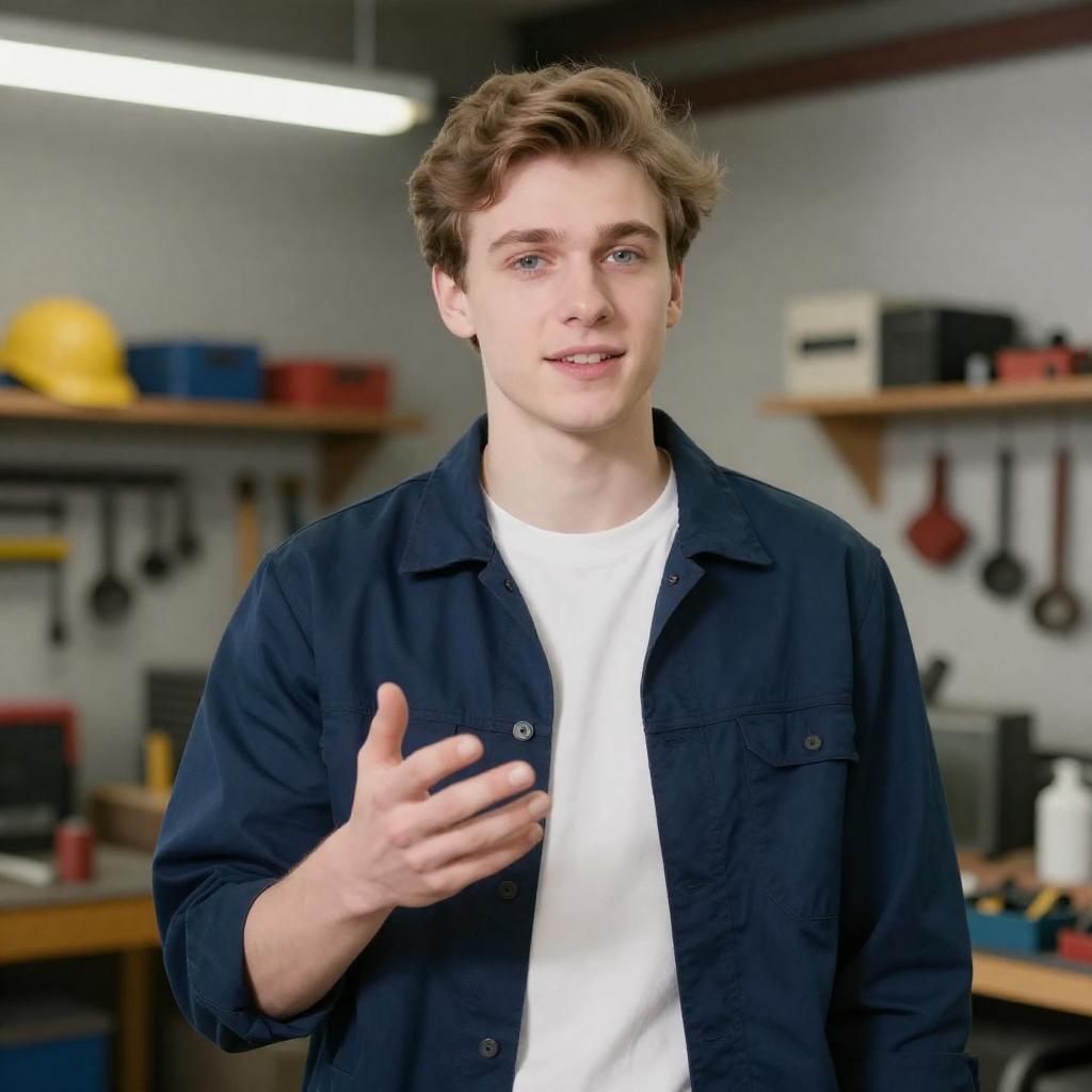 Young Mechanic Gesturing in Workshop