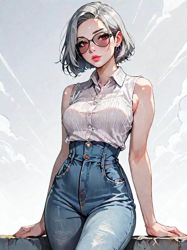 1girl, source_comics, realistic face, full body shot, Woman, casual chic, faux fur vest in shades of gray and black, sleeveless, ribbed hem, worn over a light gray tank top, fitted blue denim jeans, mid-rise waist, subtle fading along the thighs.