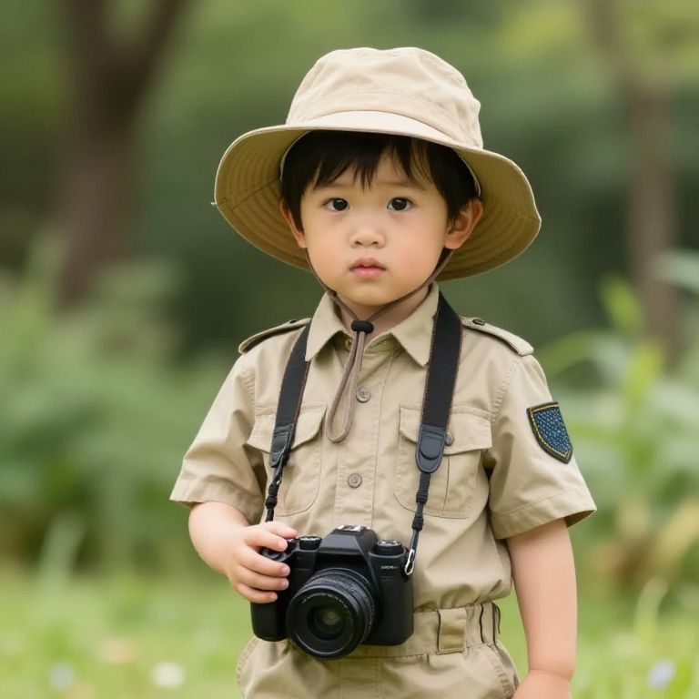 "Toddler Zookeeper, boy in safari gear with a camera and a hat"