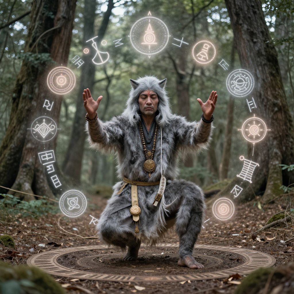 Gray tabaxi shaman performing a ritual in a sacred forest clearing, surrounded by floating mystical symbols and glowing runes, fur infused with faint ethereal light, eyes closed in deep concentration, ancient trees towering above.
