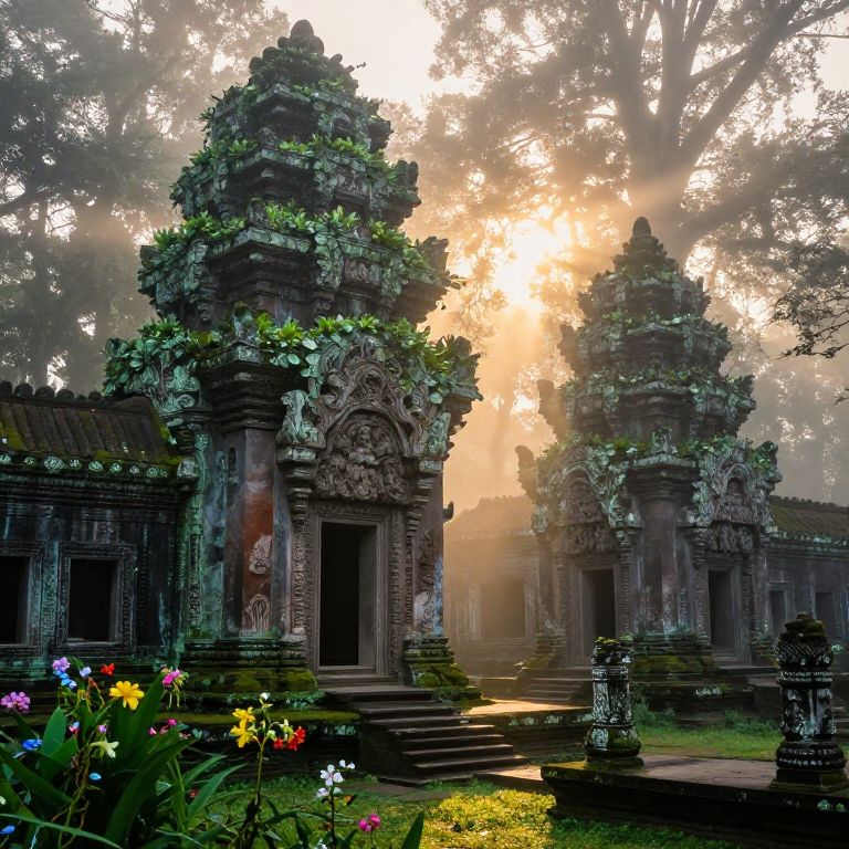 Photograph of ancient, weathered stone temples covered in lush green moss and vines, set in a misty, sunlit forest. The temples have intricate carvings and tiered, pyramid-like roofs. Sunlight filters through tall trees, creating a golden glow around the temples. In the foreground, colorful flowers and greenery add vibrancy. Stone steps lead up to the entrance of the central temple. The scene is ethereal and serene, with a mix of natural and historical elements.