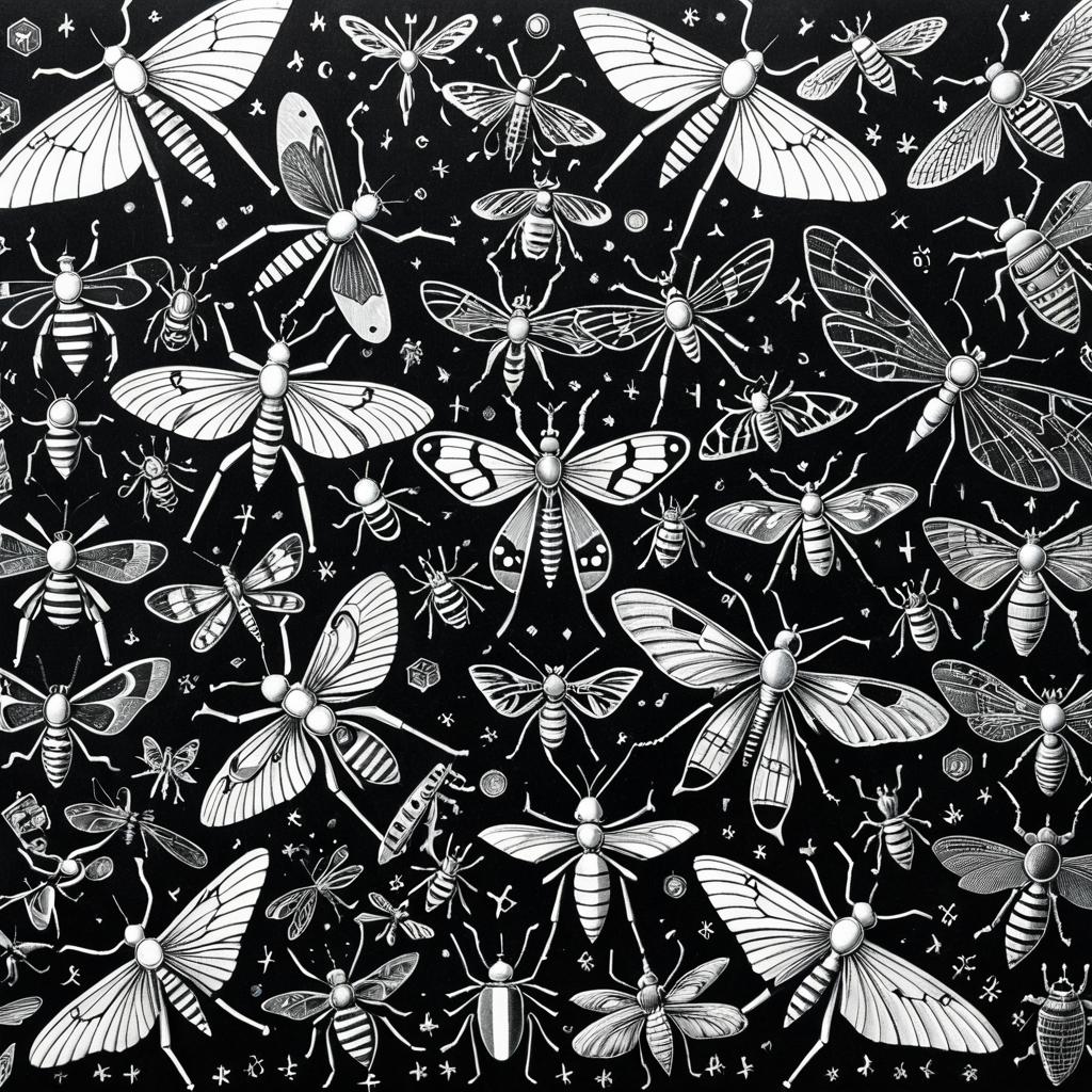 A detailed black and white etching depicting a variety of metallic mechanical insects. The artwork features intricate line work and shading with a monochromatic palette of black, white, and steel gray. The composition showcases mathematical precision and repeating patterns inspired by the style of M.C. Escher, creating a nostalgic and complex visual effect.