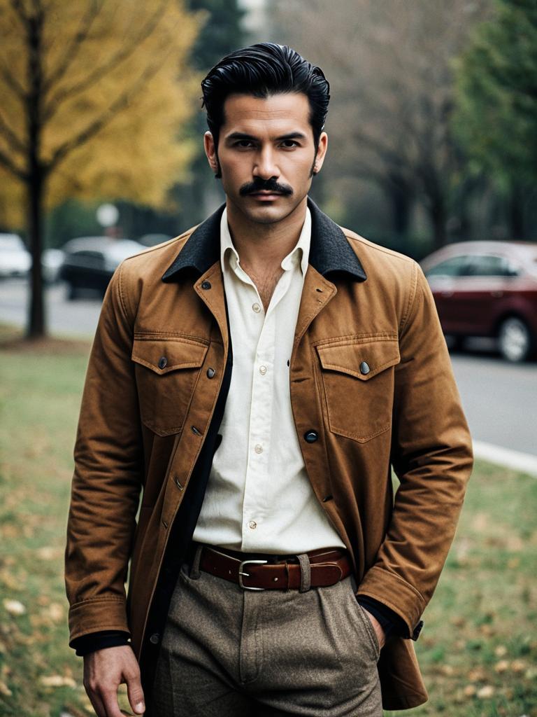 Most stylish man costume, 1boy, male focus, solo, belt, shirt, mustache, pants, jacket, black hair, facial hair, outdoors, blurry, blurry background, looking at viewer, brown pants, brown jacket, white shirt, standing, open clothes, collared shirt