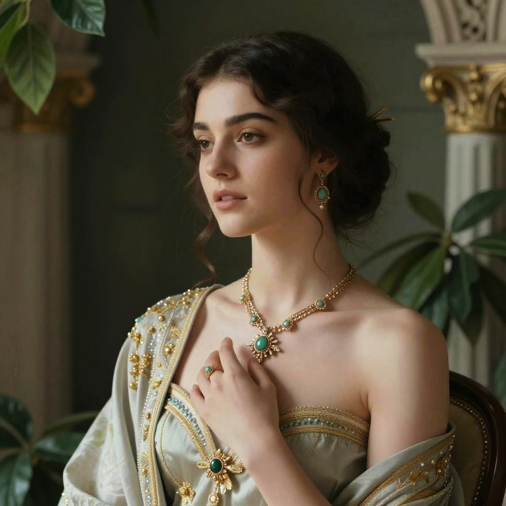 Realistic photo.Elena, characterized by long dark hair, bright blue eyes, and a regal presence, wearing Ornate robes, highly detailed and realistic rendering. realistic photo
