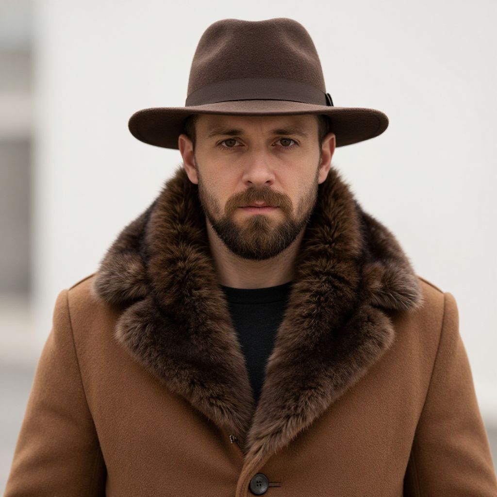A man with a beard and a brown hat is wearing a brown coat with a fur collar.