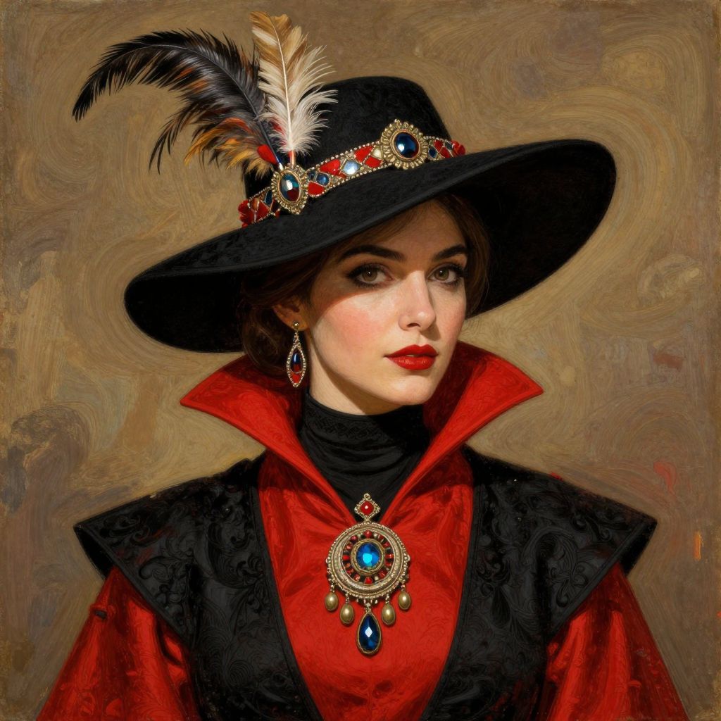 A woman in a black hat adorned with feathers and intricate designs, wearing a bold red and black outfit with a high collar and a detailed pendant, in a fantasy art style reminiscent of Ismail Inceoglu's work.