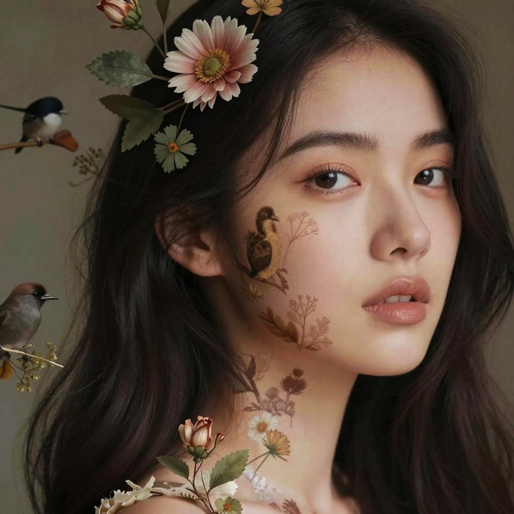 Face modification combined with nature, human face merging with botanical elements like leaves, flowers, and vines, vibrant natural colors with intricate detail, a harmonious blend of organic and synthetic, fantasy art style with ethereal lighting.