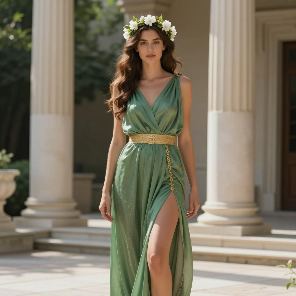 Photorealistic image of a woman dressed in a green ancient Greek-style dress featuring a gold waistband and a thigh-high slit. She wears a white flower crown and has long wavy brown hair. The setting is a sunlit courtyard with classical stone columns and lush greenery in the background. The woman has a slender build, fair skin, and a confident expression, standing gracefully in soft natural light.
