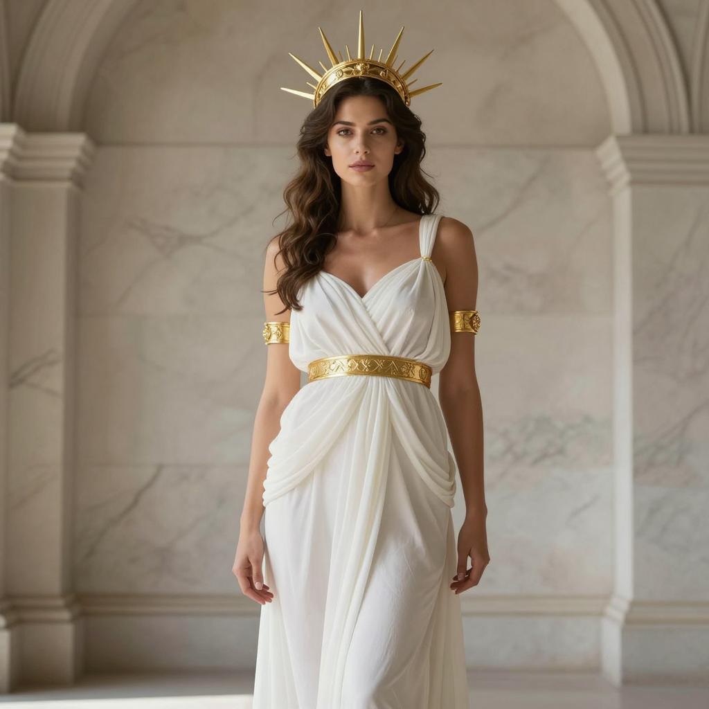 Greek goddess costume green, photorealistic, beautiful woman, green ancient Greek-style dress, gold waistband, thigh-high slit, white flower crown, long wavy brown hair, standing in sunlit courtyard, stone columns in background, soft shadows, daytime, lush greenery, confident expression, slender build, fair skin, detailed ures, natural light, fantasy setting, photorealistic CGI style, elegant, serene atmosphere, classical architecture, detailed fabric folds