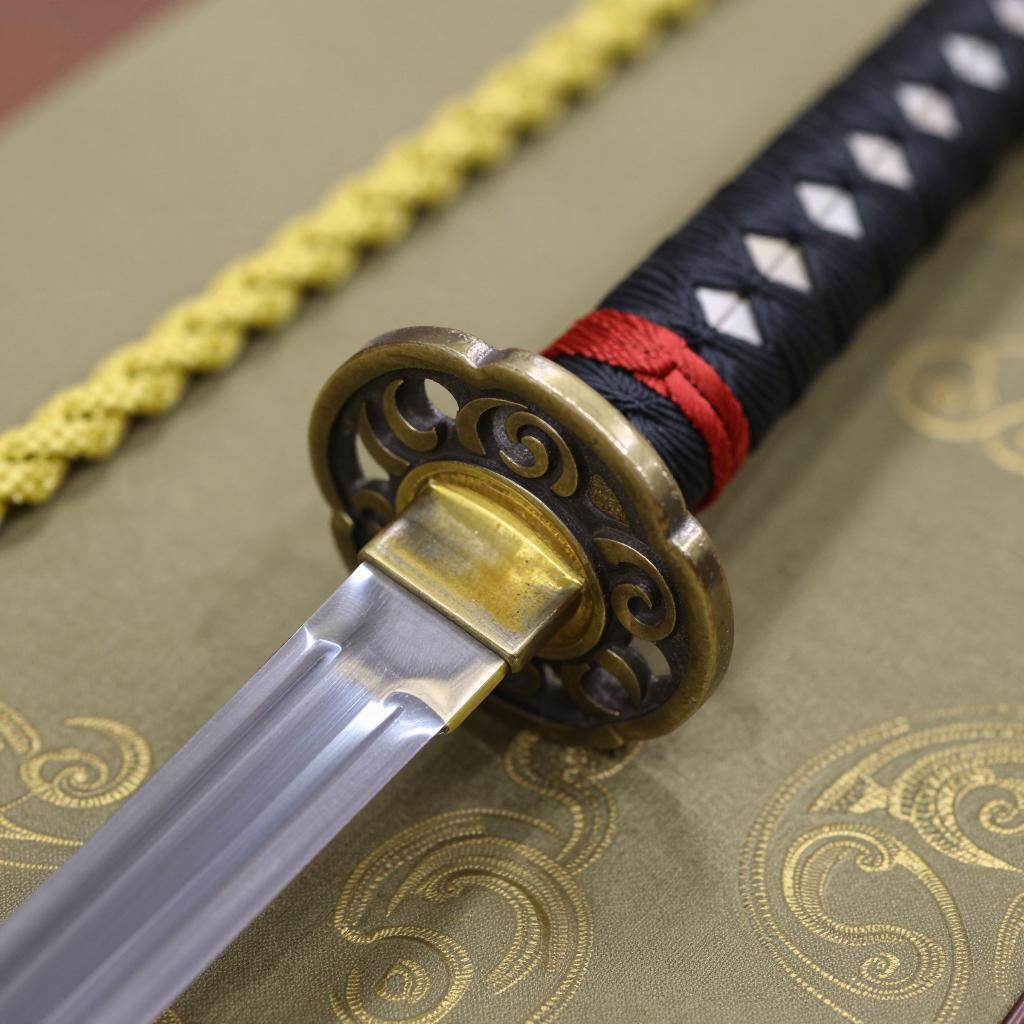 Close-up photograph of a katana blade's handle guard. Intricate bronze guard with swirling patterns, centered around the sword's tang. Red braided cord runs parallel to the blade. Golden-patterned fabric beneath. Yellow rope in the background.