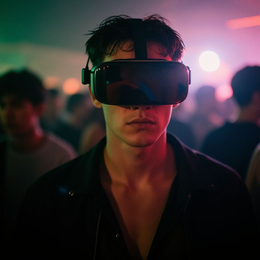 (realistic analog style sharp focus 8k raw photo with soft lighting and high quality:1.1), (hdr film grain:1.2), (cyberpunk, light flare:1.3), looking at viewer, man at a rave, seductive, red green blue, vr visor