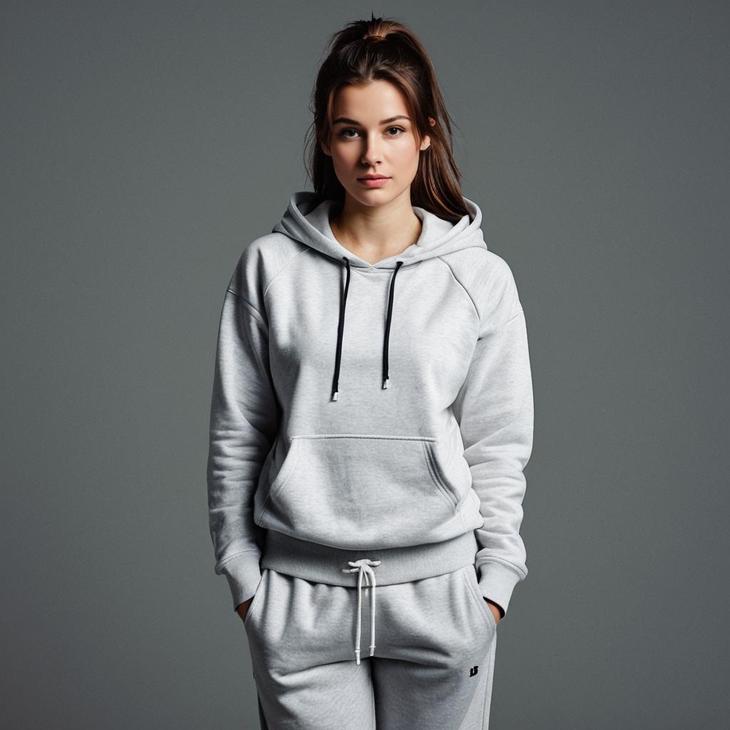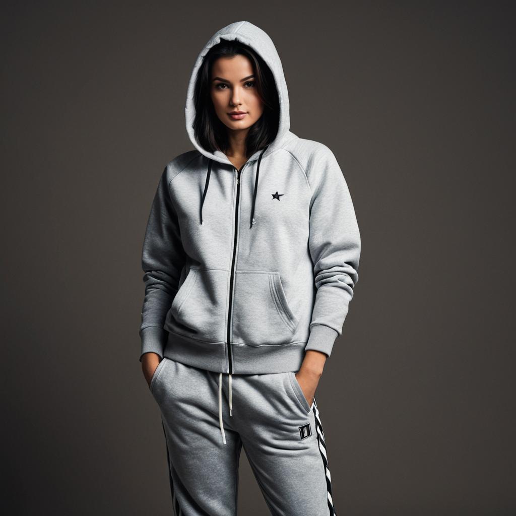 Portrait of a young woman with brown hair wearing a grey zip-up hoodie with a star emblem and matching grey sweatpants with black and white side stripes. She stands with hands in pockets against a plain grey background, wearing a casual and sporty tracksuit outfit.