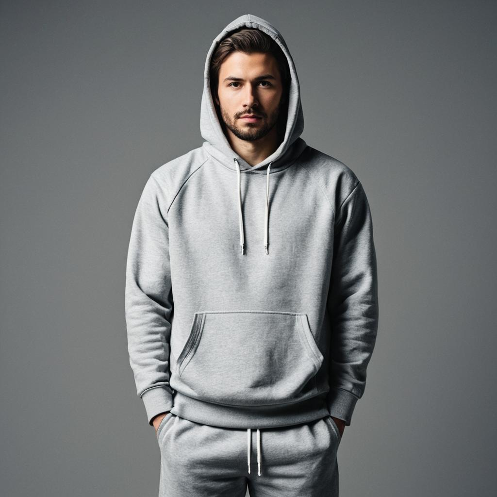 Woman tracksuits costume ,solo, hood, realistic, male focus, 1boy, grey background, hoodie, simple background, hands in pockets, pants, black hair, standing, cowboy shot, brown hair