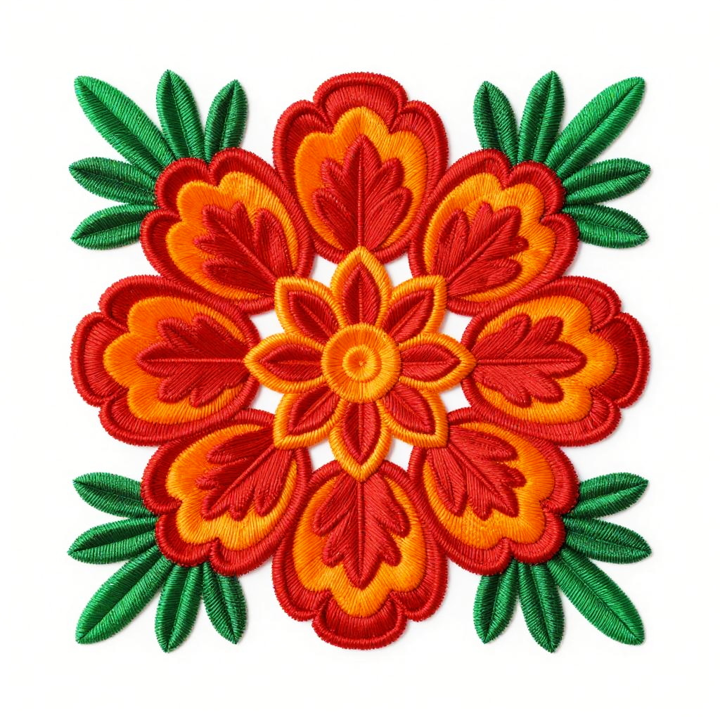 Mexican flower design with detailed embroidery textures, vibrant reds, oranges, and greens, traditional Otomi style motifs, symmetrical and bold with a festive cultural vibe