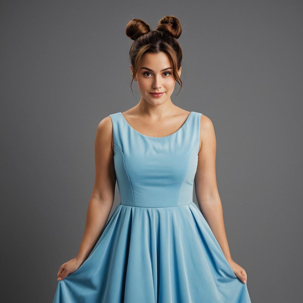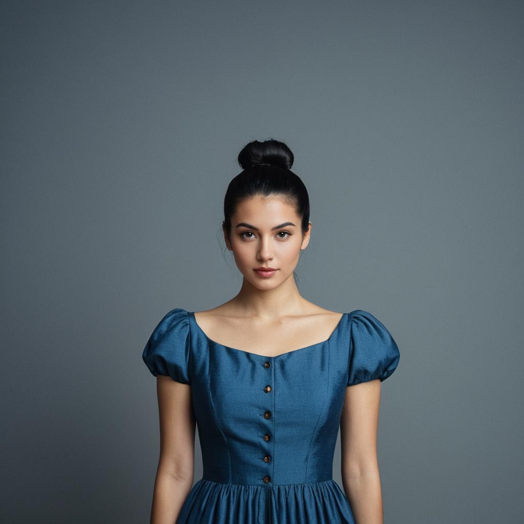 Button dress woman,1girl, solo, dress, hair bun, black hair, short sleeves, blue dress, single hair bun, looking at viewer, standing, realistic, brown eyes, lips, grey background, collarbone, arms at sides