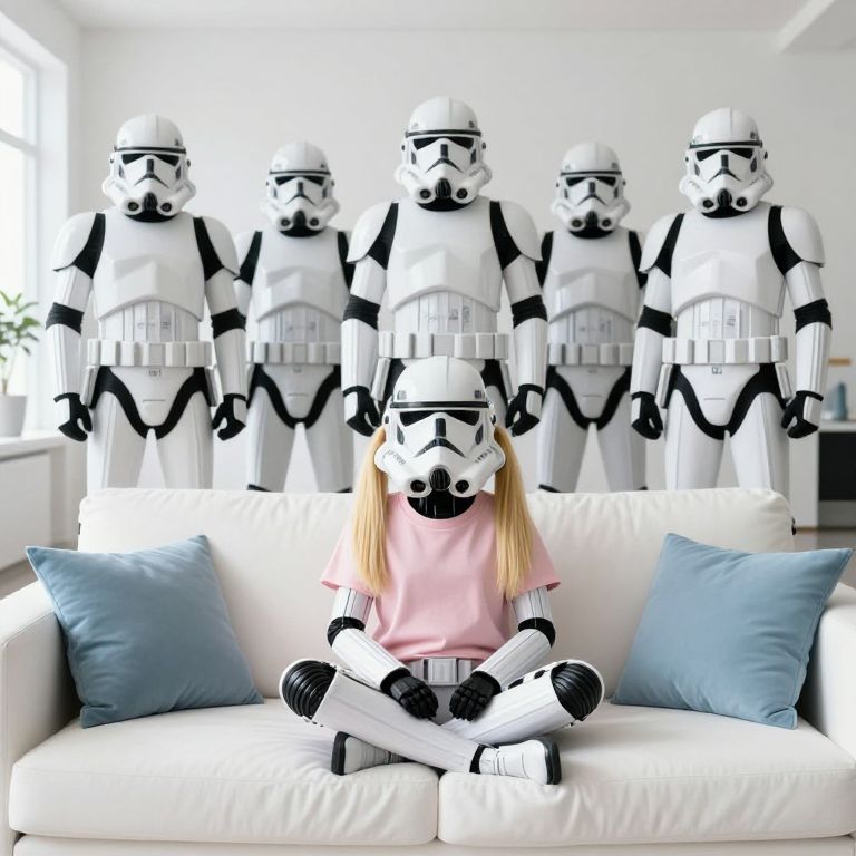 A blonde caucasian girl wearing dirty Star Wars ‘stormtrooper’ armour resting against a tree in the Endor forest, a Stormtrooper helmet is by her side in the ground, an E-11 blaster is resting on the ground, she is smoking a cigarette, long flowing blonde wavy hair, cute face, slim, small breasts, petite body, 18 years old, detailed symmetrical brown eyes, perspective, wide shot, smoke, 18mm, depth of field, colourful, daylight