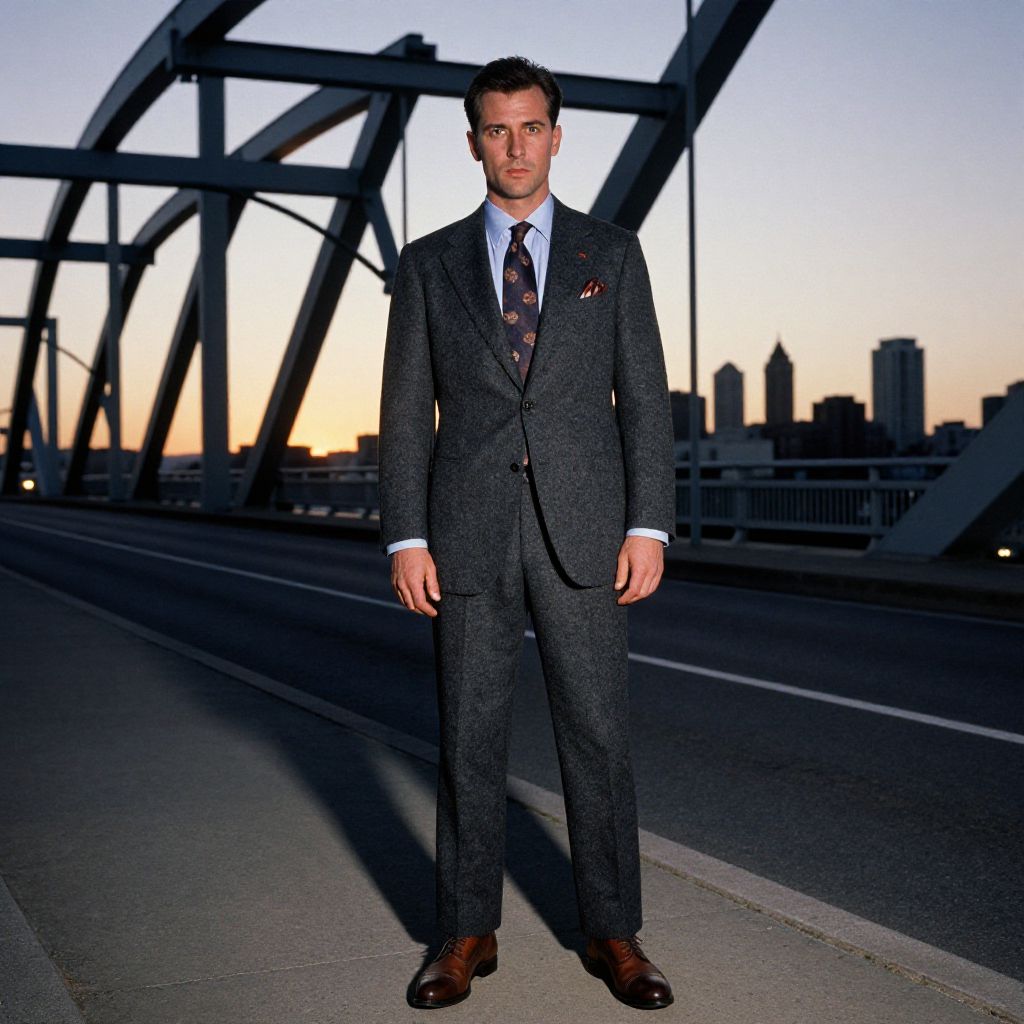 A man, tweed suit in charcoal gray, light blue shirt, patterned silk tie, brown leather brogues, wool pocket square, modern steel arch bridge, city skyline in the background, vibrant sunset casting shadows, kodacolor analog film, confident expression. Man has masculine face and piercing eyes
