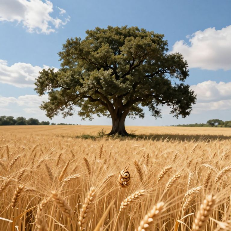 Envision an idyllic countryside setting with a solitary, grand oak tree situated amidst an expansive field of shimmering golden wheat beneath an azure sky dotted with delicate white clouds, reminiscent of the impressionistic techniques employed by artists like Monet. This tranquil landscape is unexpectedly transformed when viewed from the unique perspective of a minuscule creature residing within a single grain of wheat, unveiling intricate details of nature's microcosm that remain unseen to the unaided eye. The image masterfully captures both the majestic grandeur and serene tranquility of the natural world, stirring feelings of awe and wonder at the hidden beauty and complexity within our surroundings.