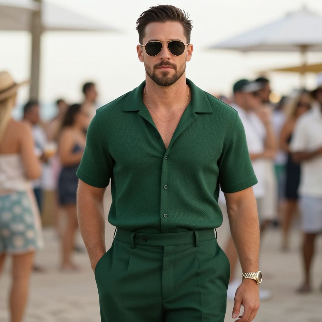 Photograph of a handsome, bearded man with short, dark hair and a trimmed beard, wearing dark green, short-sleeved button-up shirt and matching pants. He has on black, round sunglasses and a gold watch on his left wrist. His hands are in his pockets, and he stands confidently in a crowded, sunlit beach setting. The background is slightly blurred, featuring people in summer attire, including a woman in a white top and blue patterned shorts. The overall style is modern and stylish, with a focus on casual yet chic beach fashion.