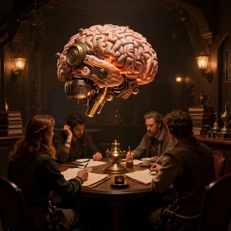 AI for DND: a steampunk-inspired mechanical brain with glowing circuits, assisting a group of fantasy adventurers planning their quest inside a cozy tavern, filled with ancient books and magical relics, moody lighting, intricate concept art