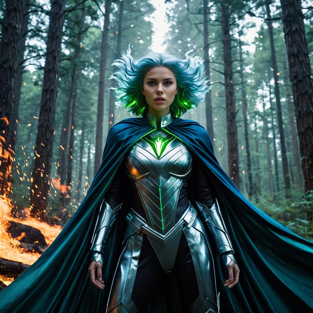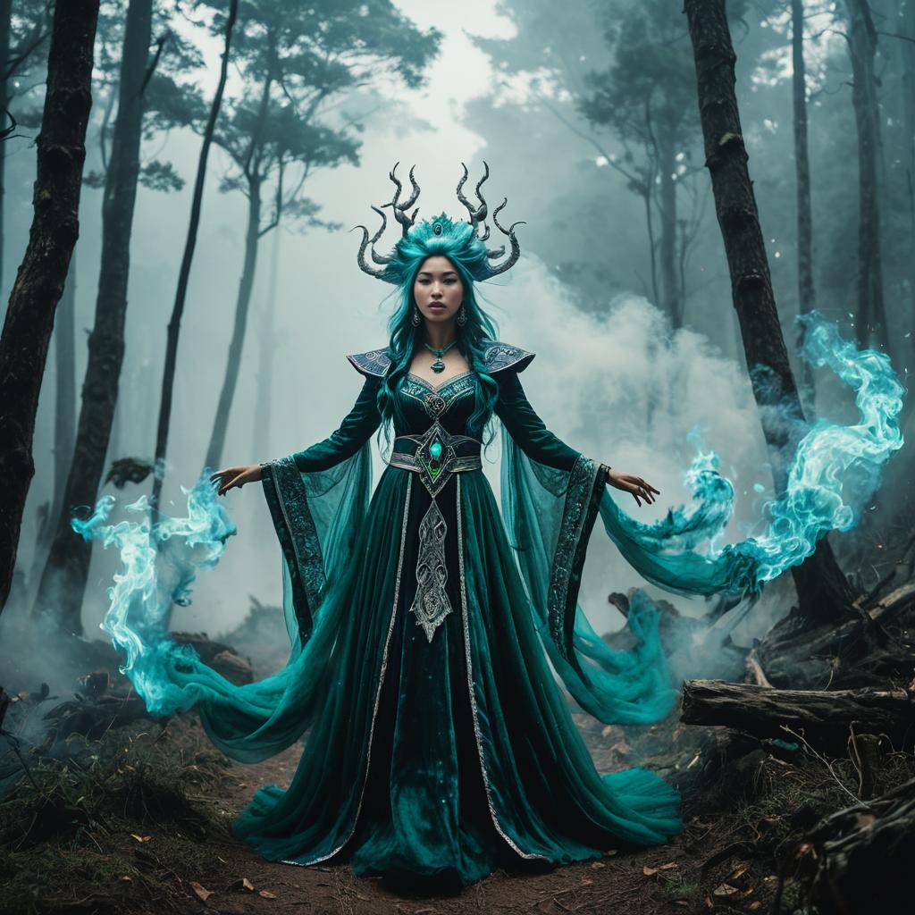 Mysterious Asian sorceress levitates above ancient forest clearing filled with magical fog, her stunning brown eyes glowing with malice, elegant angry features and gritted teeth, wearing a flowing emerald gown adorned with silver runes, big blue flaming wig, blue fire swirling around her, slim silhouette, highly detailed photo, 4K, cinematic lighting.