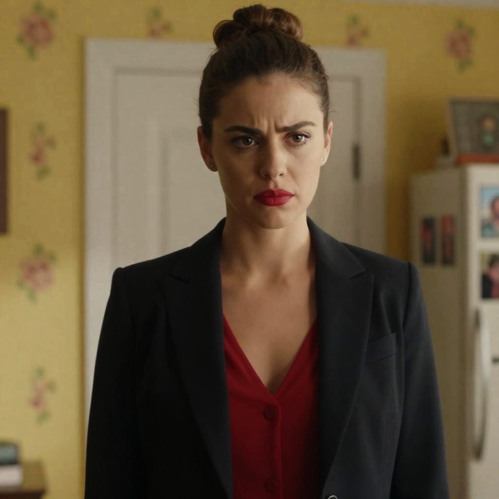 Photograph of a rustic room with wooden walls. Central woman with long brown hair, deep blue V-neck shirt, hands on hips, intense expression. Blonde woman to the right, smiling, also in a low-cut shirt. Background: two women in white shirts, one with dark hair, one with light hair, sitting. Clothing and bags hang on the wall. Dim lighting with one visible light bulb.