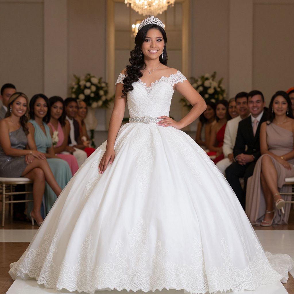 Photograph of a beautiful Latina bride with long black hair, wearing a white lace wedding gown and tiara, standing confidently in a dimly lit ball