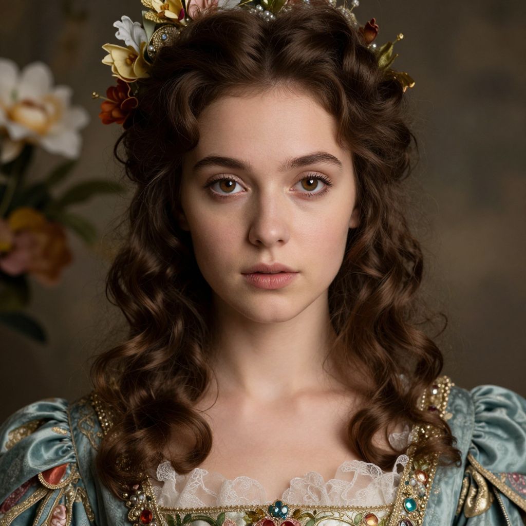 Photograph of a young Caucasian woman with fair skin and dark, wavy hair adorned with a floral crown. She has large, brown eyes, a small nose, and full lips. She wears a detailed, medieval-style dress with puffed, teal sleeves and intricate gold and gemstone embellishments. The dress has a white lace trim. The background is a softly blurred, dark, and floral theme. The woman's expression is neutral, and the lighting highlights her delicate features, giving the image a classic, fairy-tale aesthetic.